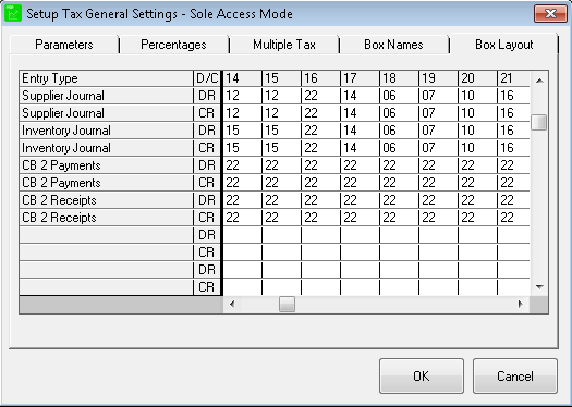 Click on Setup->Tax->General Settings and click on the Box Layout tab. You will have to enter the applicable tax codes next to each entry type as indicated in the screenshots below. Please note that you may have more entry types as the ones illustrated below, but these are the basic entry types any set of Pastel Accounts should have: